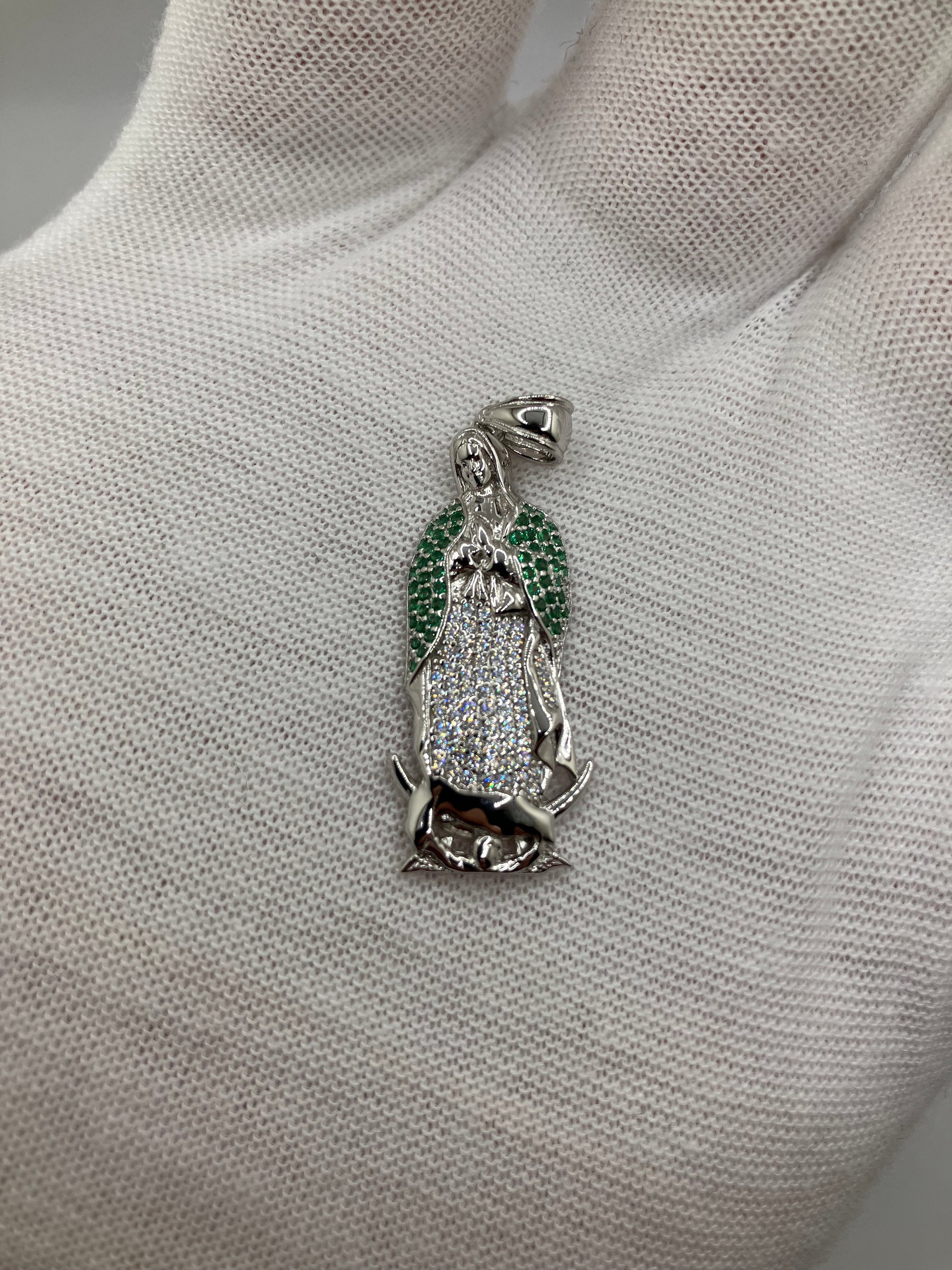 Este colgante de la Virgen María está elaborado en plata de ley 925 con baño de rodio para un brillo intenso y duradero. Incorpora circonitas verdes y transparentes que realzan el manto de la Virgen, aportando brillo y detalle al diseño. Elegante, significativo y llamativo. Perfecto para usar a diario o para regalar.