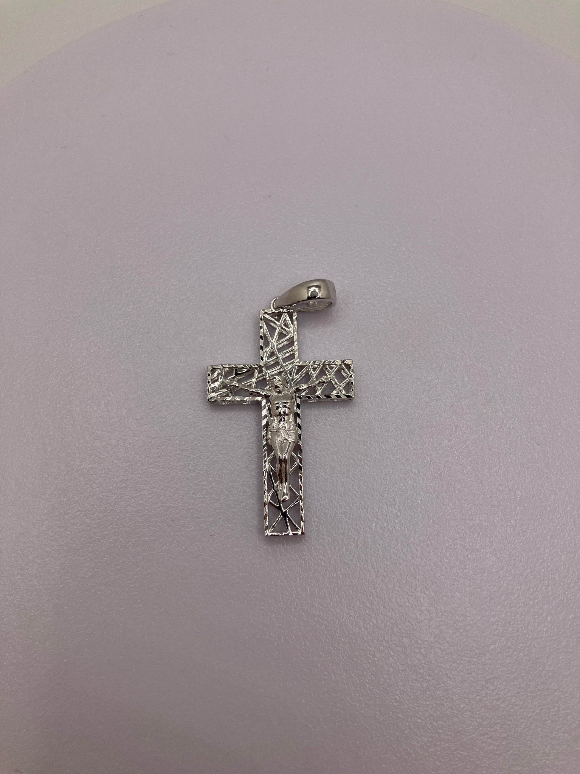 Finished with a layer of rhodium plating, the pendant offers enhanced brilliance, tarnish resistance, and long-lasting durability while maintaining its polished silver tone. The detailed crucifix stands out against the textured openwork cross, giving the piece depth while remaining lightweight and comfortable for everyday wear.