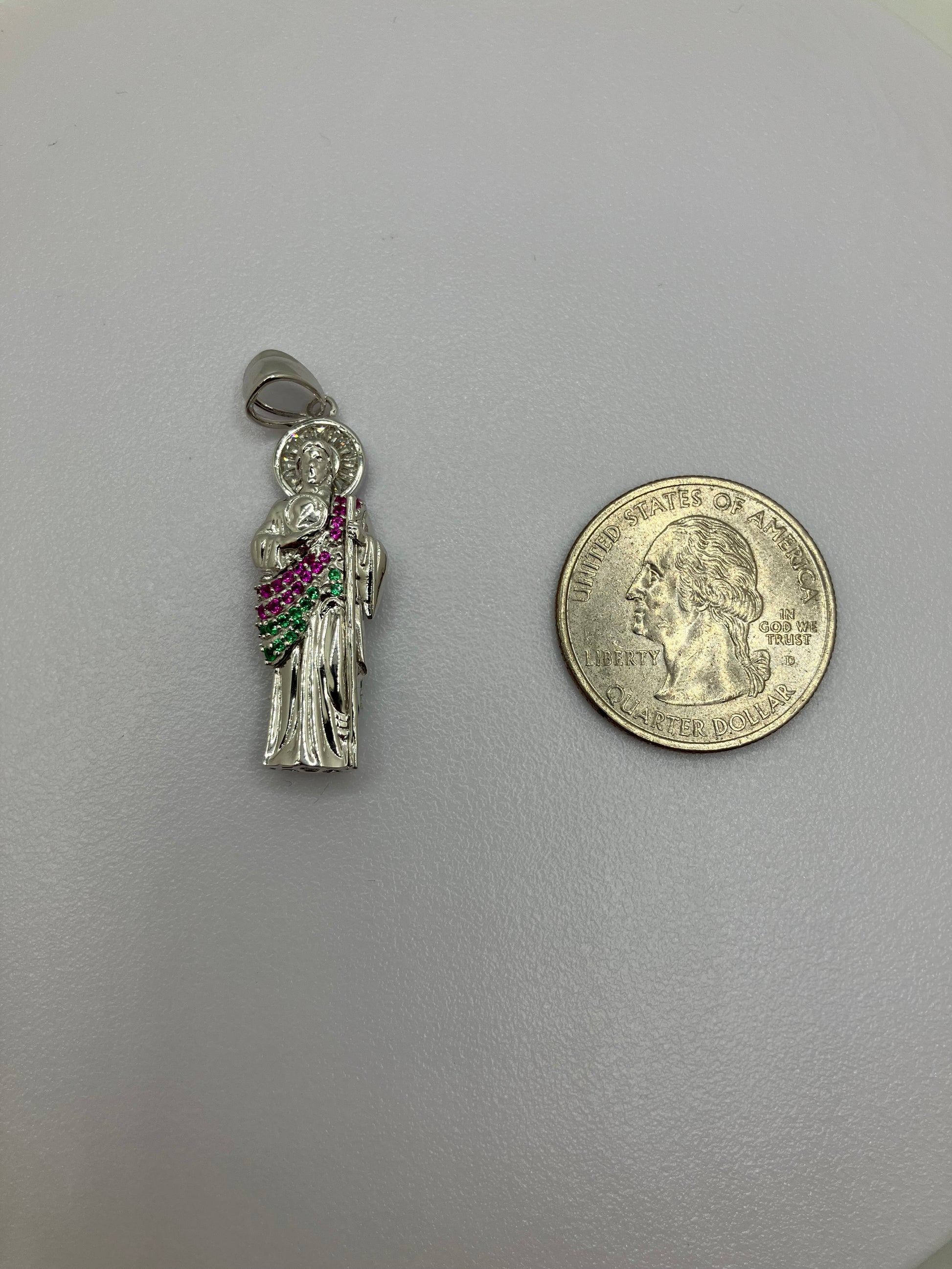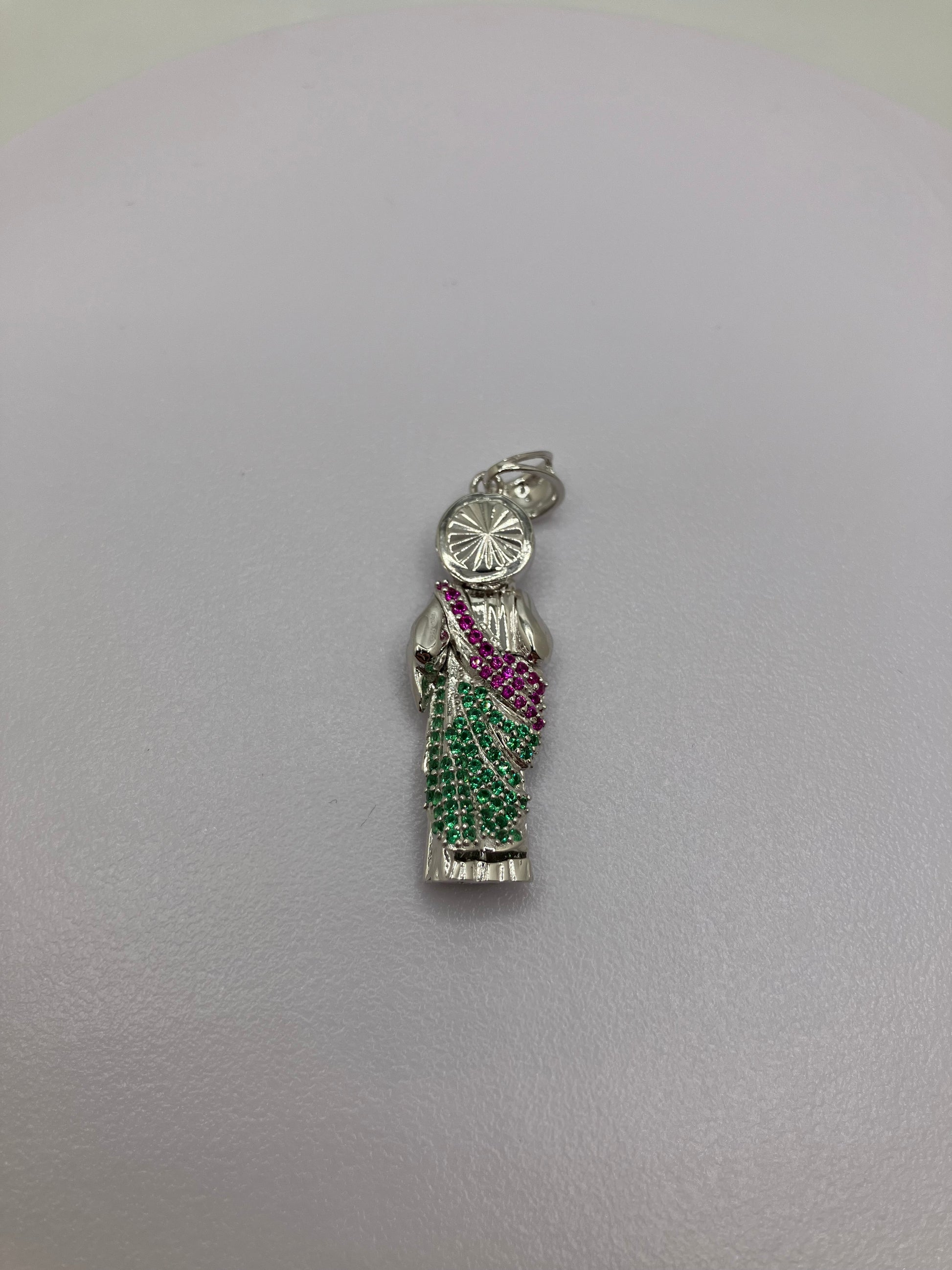 This beautifully detailed pendant features Saint Jude, the patron saint of hope and impossible causes. Crafted in rhodium-plated .925 sterling silver, it offers a bright durable shine that resists tarnish. The robe is accented with green and purple Cubic Zirconia stones, adding a vibrant, eye-catching touch to the traditional design.