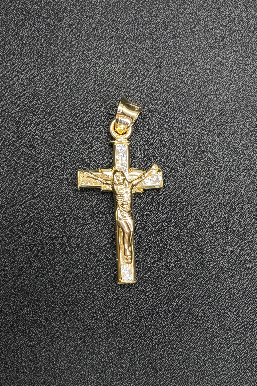 Twelve brilliant clear cubic zirconia stones are carefully set along the cross, adding balanced sparkle without overpowering the classic crucifix design. The detailed figure of Christ is finely engraved, creating depth, dimension, and a premium finish that stands out whether worn daily or reserved for special occasions.